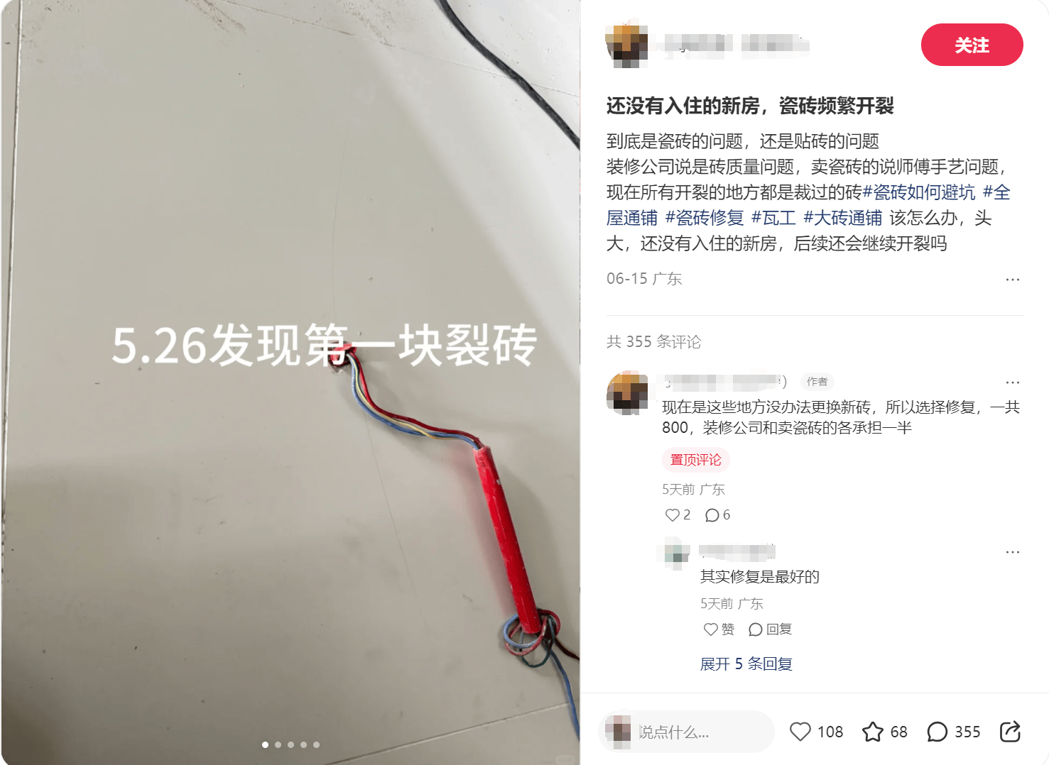 还有一名消费者正在铺贴完地砖后发觉。